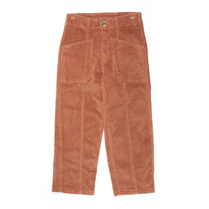 The Woodfern Cord Pant is a high-rise wide leg pant with a retro feel. Constructed from a soft 9 wale stretch corduroy that allows for easy movement, it has utility patch pockets on the front and back to keep your belongings secure, and seams are reinforced with thick thread and double needle stitching. Finished with unique vertical seams on the front and back a stitched label on the rear pocket.