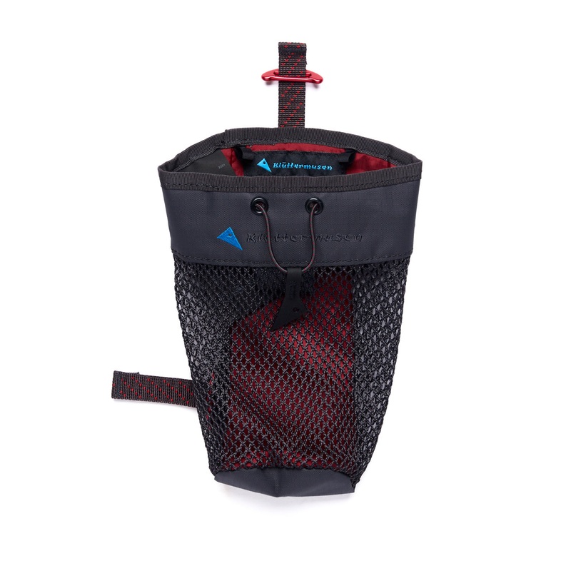 A simple attachment for Klttermusen packs, which slips into place with aluminium toggles, and retains its shape with or without a bottle in place. It also has a harness loop so that it can be attached through a belt or harness.