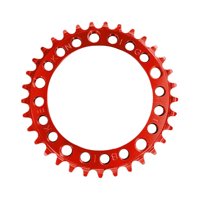 “TheKnight Bike CoStarfighterRuf-Tooth Chainring 5-Hole 110 BCD Chainringis a lightweight American made sprocket that is compatible with 1/8″ chains. It is machine down to a 33t and 36t from a solid chunk of aluminum. Combine that with it hard anodizing this chainring is strong and makes your bike ride smoother. The teeth are tapered so the chain falls on smooth and fits 5 Bolt 110 BCD Spiders. If you want a strong lightweight sprocket bolt one to your bike now.”
