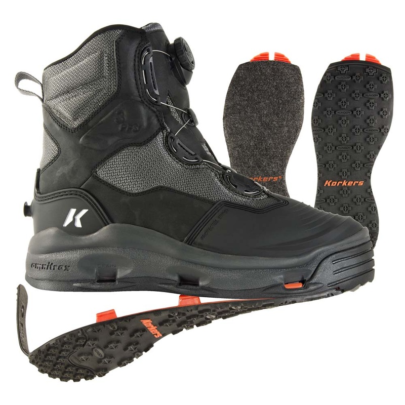The Korkers DarkHorse Wading Boots are a remastered classic designed for the angler that values both weight and durability. With the OmniTrax Interchangeable Sole System, Boa M2 Fit system, and hydrophobic upper material, you’ll have optimal traction and a custom fit. The molded TPU Toe Cap and internal drainage system add durability and comfort to this high-performance boot.