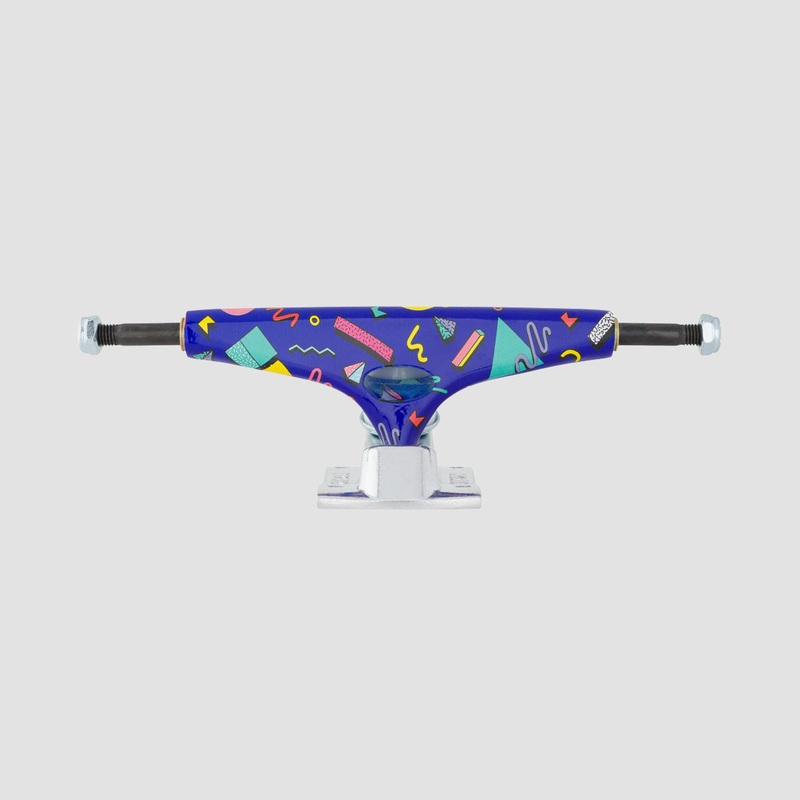 Krux K5 90’s DLK trucks feature a 1990’s inspired graphic wrapped hanger, polished silver baseplate with white cushions and silver hardware.