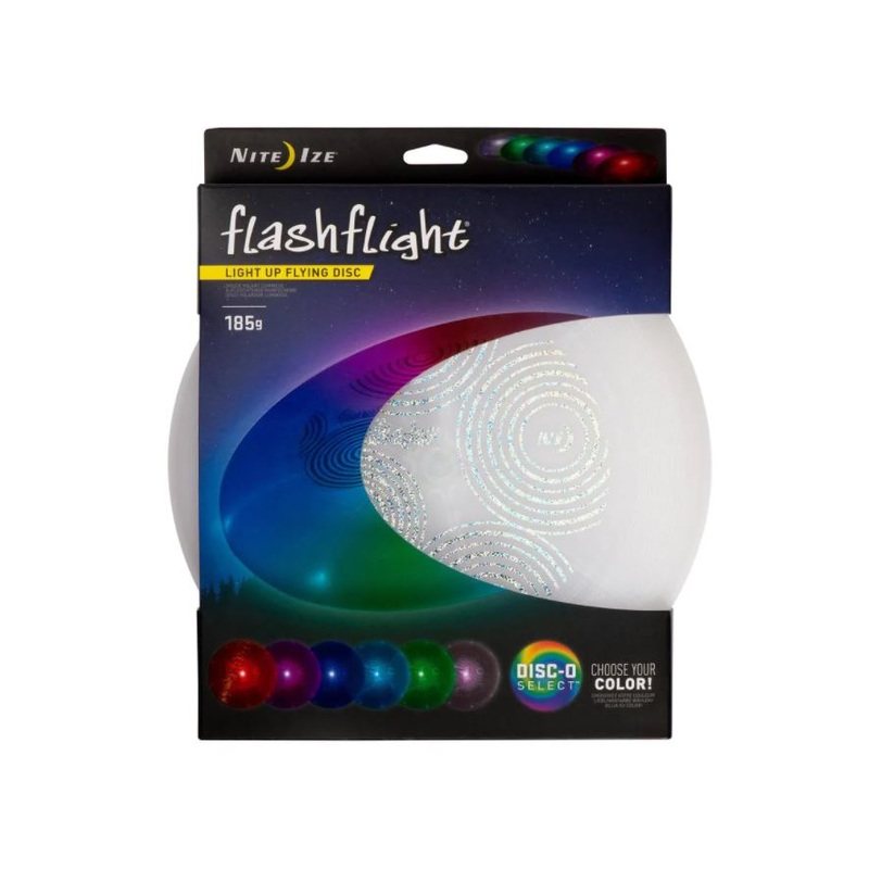 The Flashlight with Disc-O Select is a high-quality flying disc that's as much fun to play with during the day as it is at night. Simply press the button and the long life (100,000 hrs) LED lights a patented fiber-optic array that extends to its rim, illum