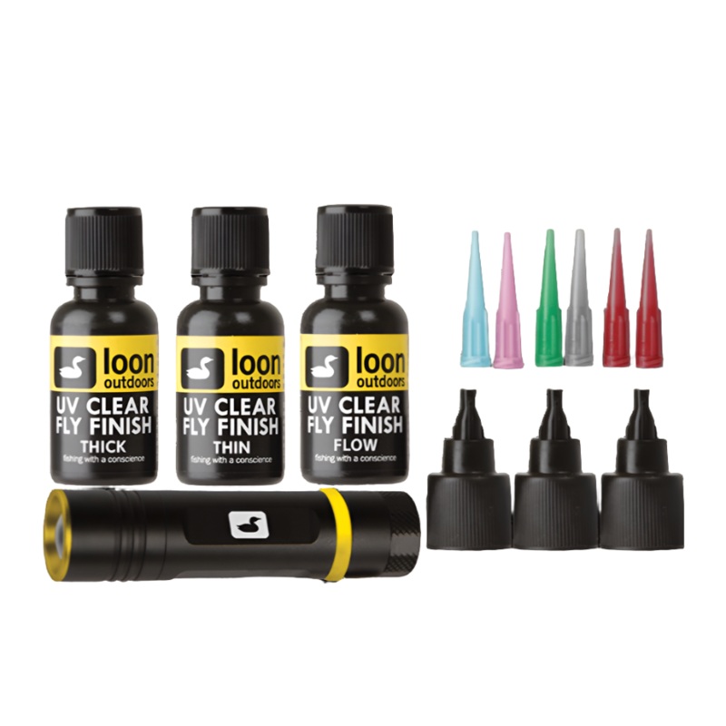 TheLoon UV Fly Tying Kit is a versatile collection of three thicknesses of UV resin plus a powerful curing lamp.With everything a tyer needs to make the move from traditional cements to UV curing flies, the UV Fly Tying Kit includes UV Clear Fly Finish Thick, Thin and the brand new, ultra-thin Flow, plus a UV Bench Light.
