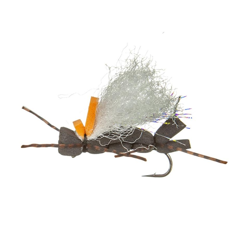 Jake’s Trigger Belly Foam Bug from Montana Fly Company has a classic terrestrial profile with a two-tone foam body and a red trigger point tied into the belly. The white parachute and orange sighter post make this bug easy to see at a distance.