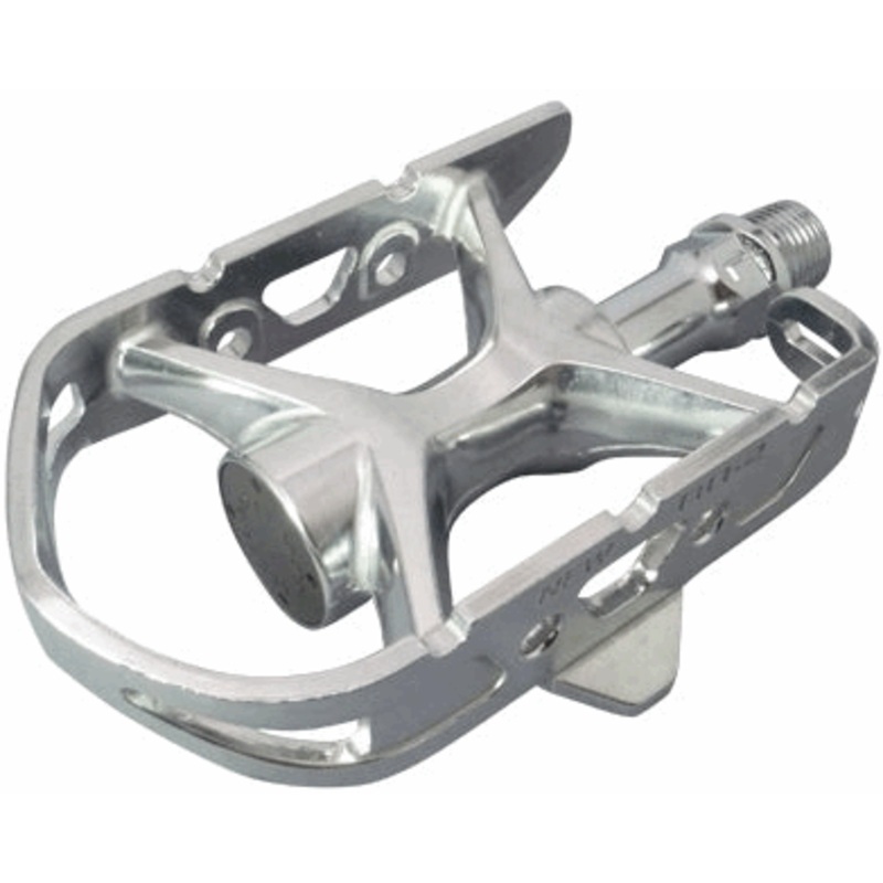 The MKS AR-2 is a modern quill-style road pedal. The AR-2 features a unique asymmetrical cage plate design that allows for additional inboard clearance at the quill for wide shoes when compared to traditional pedals such as the Sylvan Road. The AR-2 is designed to be used with toe clips and straps.
