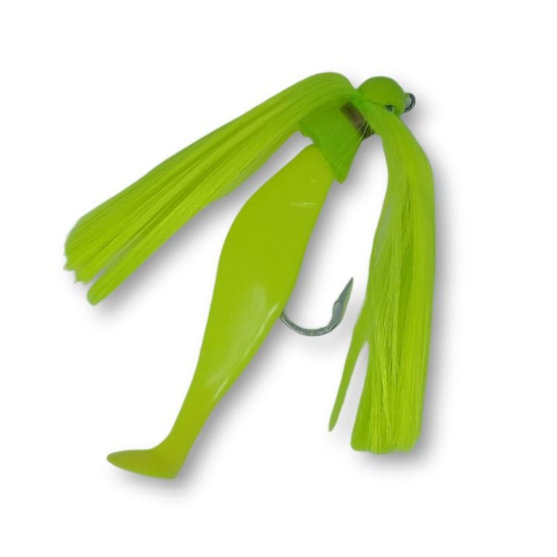 Mojos are magic! One of the best lures to troll for striped bass off the east coast. Troll as a solo lure or as part of a tandem rig, these mojo jigs come in sizes from 2 ounces to 32 ounces, and in two colors, white or chartreuse. Round lead heads with eyes rigged with a quality Mustad hook, nylon parachute skirt, and a soft plastic swim shad. Striped bass cannot resist.