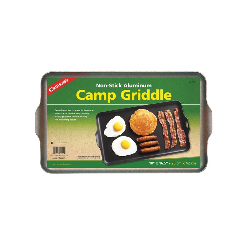This griddle is made of heavy gauge aluminum and features a coated non-stick surface for easy clean-up. It extends over two burners of most camp stoves providing adequate room for making a full course breakfast the outdoor way!
