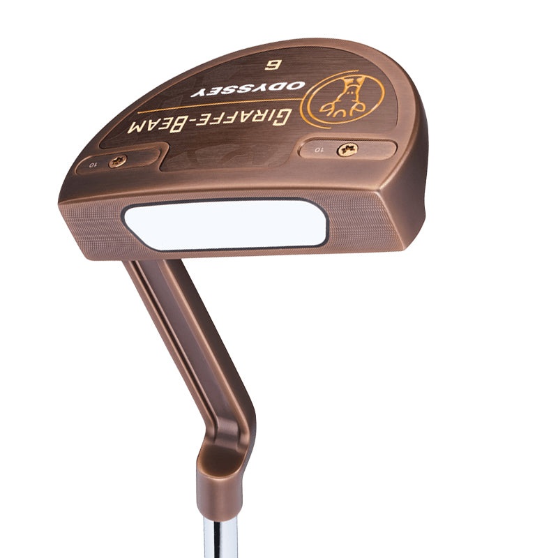 The GIRAFFE-BEAM putter features an extended crank hosel for improved face balance and a more stable stroke. Its H-shaped cross section enhances rigidity and reduces face twisting, making it lighter and more forgiving on off-center hits. With Odyssey’s White Hot insert and a distinctive giraffe-themed design, including a copper finish and patterned details, this putter combines performance with unique style.