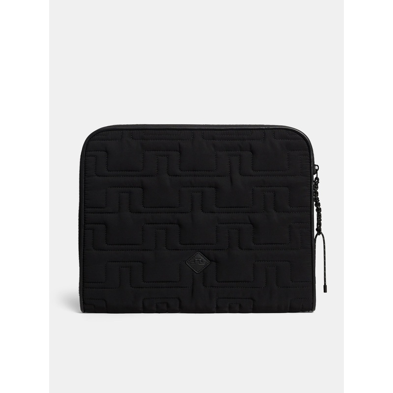 Introducing our Padded Laptop Case crafted from streamlined, sporty nylon quilted material adorned with an all-over embroidered Bridge design. The case is accentuated by leather side panels, tubing, interior compartments and finished with a leather diamond Bridge logo. The thoughtful design extends to the zipped pouch, featuring a reflective braided zip puller for both style and functionality.
