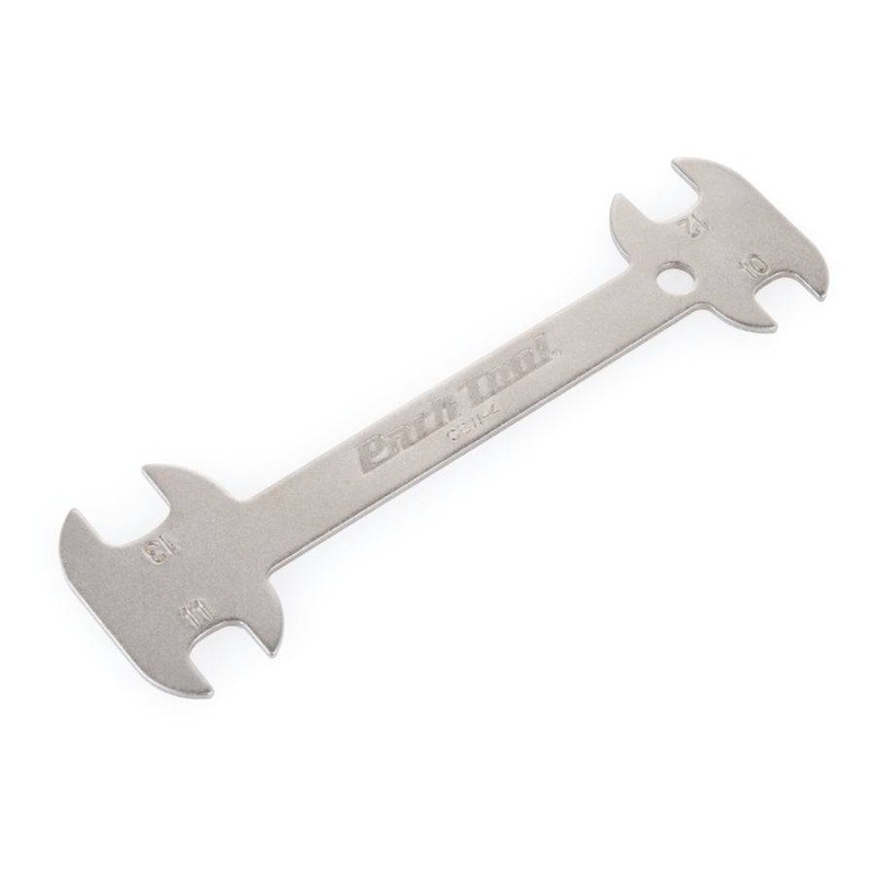 A thin offset wrench with 10, 11, 12, and 13mm openings made to fit and adjust many models of side pull and dual-pivot brakes.