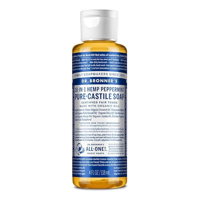 Dr. Bronners 18-in-1 Pure-Castile Soaps are multi-surface all-purpose cleaners good for just about any task. Wash body, hair, hands! Clean toilets, bathtubs, countertops, dishes-great for laundry, mopping, pets, and aromatherapy-with no synthetic preservatives, detergents or foaming agentsnone! Dilute! Dilute! OK!! Do not use this scent with children under three years old, as the tingle from the peppermint can be overwhelming for them.