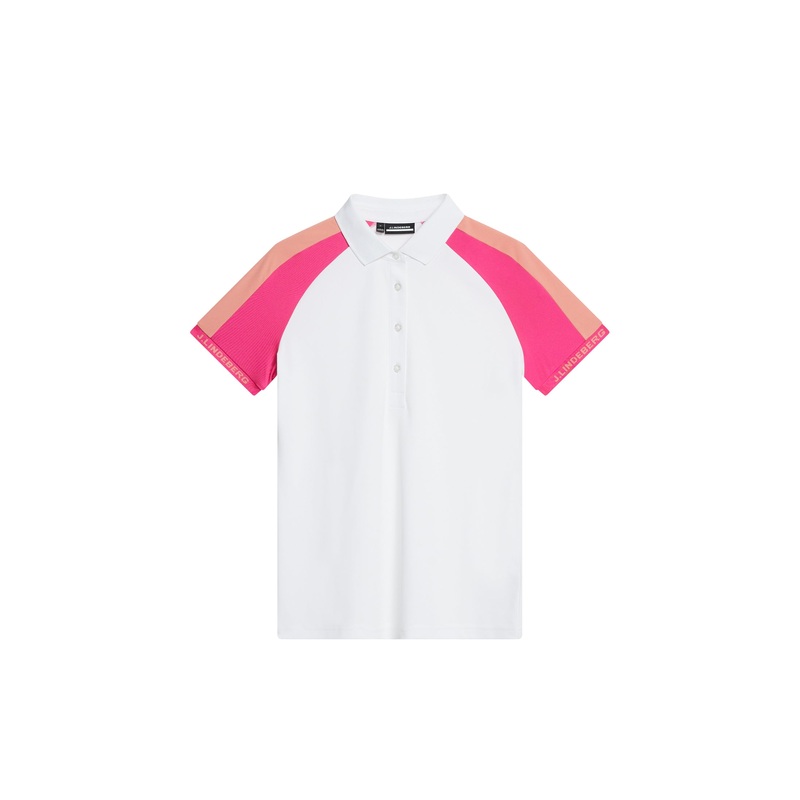 Introducing the Perinne Golf Polo, crafted from TX Jersey, a standout piece featuring color blocking and branded rib featuring a jacquard knitted J.Lindeberg logo at the sleeve end. Its designed with a ribbed collar and button placket for a classic yet mod