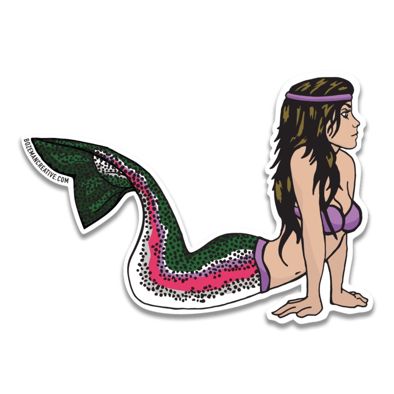 This is an original illustration by Karl Schwartz of a mermaid and a rainbow trout. The 5" wide X 3.75" tall sticker/decal is made from thick, durable vinyl with a UV laminate that protects it from scratching, rain and sunlight.SIZE: 3.75 Inches; Width: 5