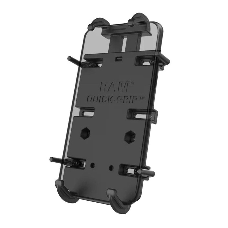The RAP-274-1-PD4U consists of a RAM EZ-ON/OFF dual strap base and the large RAM Quick-Gripphone holder. The adjustable side arms ensure that your phone will remain secured in the holder without blocking any ports or buttons. This low-profile handlebar mou
