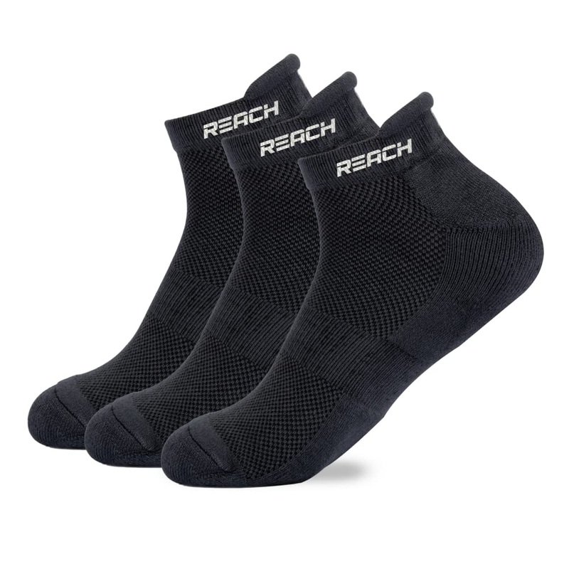 REACH Bamboo Ankle Socks for Men & Women | Breathable Mesh & Odour Free Socks | Sports & Gym Socks | Soft & Comfortable | Pack of 3 | Dark GreySUPERIOR INNOVATIVE DESIGN: Softness of Bamboo, quick sweat absorption properties and breathable & elastic mesh ensures a smooth grip and supreme comfort. Cushion pads under the feet keeps your feet dry all day. Ideal for sports, running or any physical activity. . These socks are breathable and soft, making them comfortable to wear for extended periods of time. Spandex blended with Bamboo makes these socks the best product in softness, cushioning and impact protectionANTI ODOUR: Bamboo fibres are naturally antimicrobial and moisture-wicking. Inhibits the growth of odour causing bacteria that create foul foot smell. They are hypoallergenic and gentle on the skin, making them a good choice for those with sensitive skin or allergies.BREATHABLE & THERMO-REGULATING: Bamboo socks can help regulate temperature, keeping feet cool in the summer and warm in the winter. They are durable and long-lasting, withstanding repeated washing and wear without losing shape or softness.PERFECT SIZE: Fits UK 7 – UK 11 (25 cm to 28 cm). They fit snug and provide the right amount of support to the heel, arch and the ankle, also provide a nice combination of thick and thin areas as per the foot shape requirements for men, women, boys, girls and the elderly.