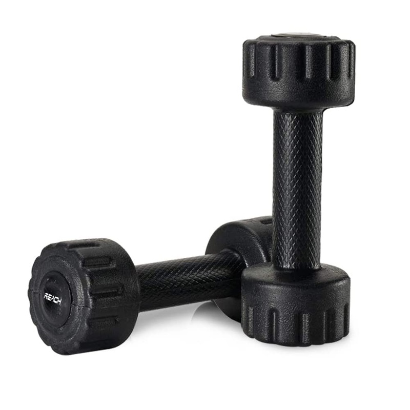 Reach PVC Dumbbell Set Weights| Pack of 2 For Strength Training Home Gym Fitness & Full Body Workout | Easy Grip & Anti- slip Dumbbell for Weight loss (5kg, Black)Functional – Reach PVC Dumbbells are multifunctional, you can restore your back flat, exercise your shoulders vigorously and shape your arm lines. Perfect for good health, balance and weight management, but also great for aerobic exercise, yoga and strengtheningVersatile- Reach dumbbell offer the ability to target specific muscle groups or perform a full body workout; Use smaller weights for upper body exercises and switch to heavier weights for lower body exercises.Anti-slip Handle – Non-slip texture dumbbell handle, gives you a comfortable feeling during the whole process of your exercise.Material-Made of high quality PVC to strengthen durability, toughness and stability. Firm Construction will not break or bend after repeated use.Easy to Store- Smaller area, unique upgrade design for dumbbell so that it occupies a smaller overall space. This Reach dumbbell can be placed anywhere without worrying about occupying spaceProtect Your Floor – Entire dumbbell surface encased with wear-resistant PVC material integral molding not easy to crack. Protect your floor from damage while maintaining an excellent texture