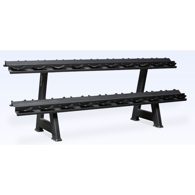 Organize and store your dumbbells in style with the Victory 2-Tier DB Rack. This rack is big enough to hold 10 pairs of Urethane Dumbbells. Its angled surface makes access easy, because you dont have to twist your wrists when you remove and replace the dumbbells.
