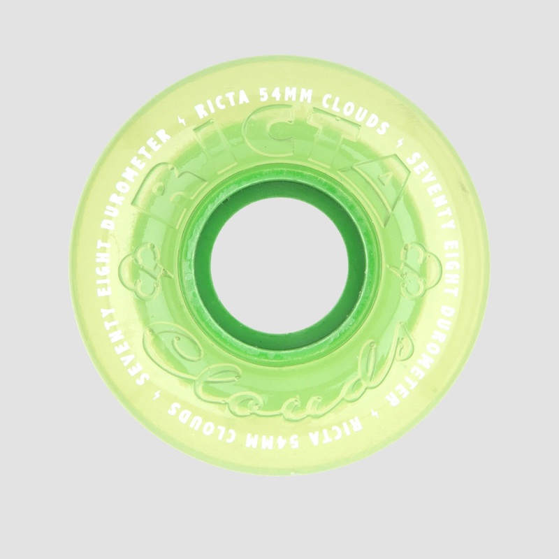 Ricta Wheel Dynamics 54mm, 78a Clouds Mojito yellow with green core and debossed and pad printed lettering. Super-soft urethane for cruiser setups and general transportation.Ricta Clouds are the most diverse cruiser wheel family in skateboarding. With size
