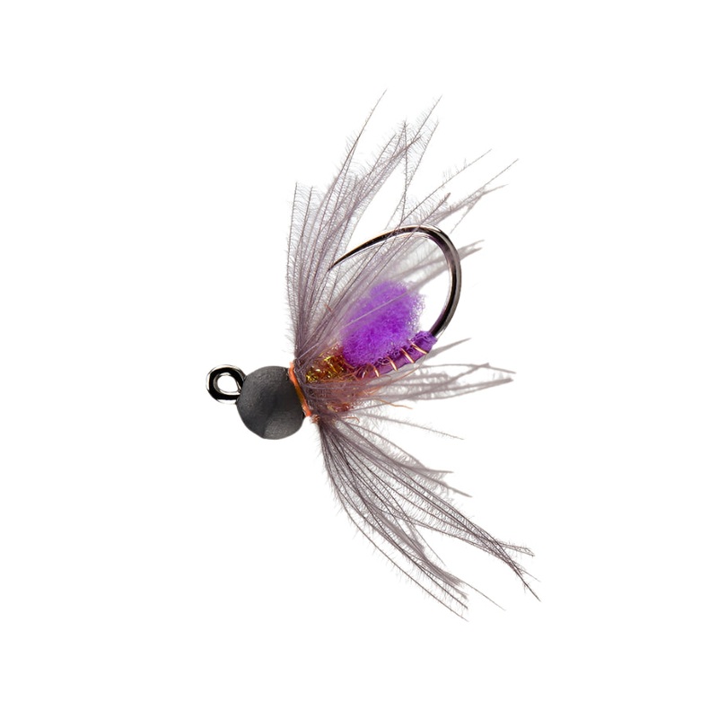 The Tungsten Bead-Headed Rock Grinder Barbless Jig Nymph from Rio Flies is designed to sink very fast and be a nice mix of buggy-ness and attraction. This Euro nymph has a hot tag of floss and a CDC collar that both wave enticingly in the current. The matt