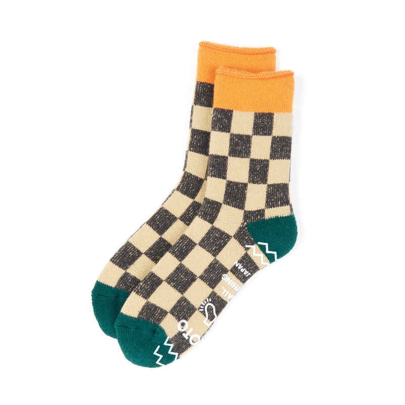A pair of checkerboard knitted room socks, made in Japan by the masterful sock suppliers at Rototo. The acrylic-wool blend provides elasticity and warmth to these insulating home/tent-suitable socks, with ananti-slip Rototo graphic printed on the sole to k