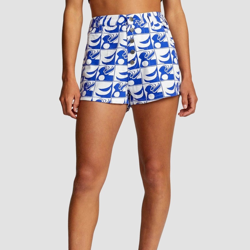 COMBINING STATEMENT DESIGN WITH SUSTAINABILITY, THE RVCA BAILEY SHORTS FEATURE AN ALL-OVER PRINT BY ARTIST BAILEY ELDER. THE SPECIAL EDITION WOMENS SHORTS ARE CUT WITH A HIGH WAIST AND LOOSE LEG FOR A COMFORTABLE FEEL THAT PAIRS EASILY WITH CROPPED TOPS AND OVERSIZED PIECES. STANDING OUT WITH AN ALL-OVER PRINT, THE ORGANIC COTTON SHORTS ADD SIDE SEAM POCKETS AND METAL BUTTONS AT THE EXPOSED FLY.