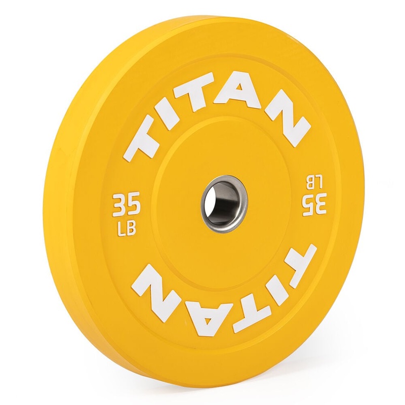Unleash your inner TITAN with the Economy Rubber Bumper Plates, color-coded to make it easier to organize and find the correct plate at a glance. Crafted from durable, solid rubber with a 50.6mm weighted steel-lined collar that reinforces the plates for training that involves dropping plates from overhead or shoulder height. Each plate features dual raised TITAN logos, LB weight indications, a raised plate lip, and is designed with a low bounce rate for more control over the barbell when it hits the ground. These easy to identify colored bumper plates are extremely durable, perfect for use in home gyms, and ready for you to max out your next PR.