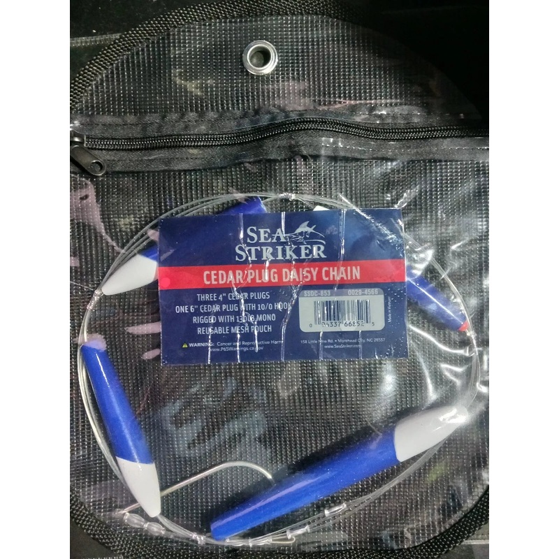 Sea Striker SSDC-853 Daisy Chain 3- 4" Cedar Plugs, 1- 6" Cedar Plug6" rigged with 10/0 hookRigged with 130lb mono leader.Brand new in zip up pouchCedar Plug Daisy Chain 4"SSDC-853