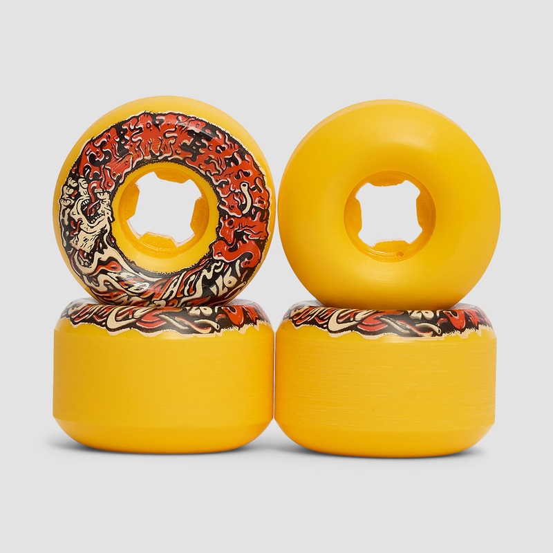 Slimeballs Vomit Mini wheels in 53mm, 97a featuring art by FALU @falucarolei (based on the original art by Jim Phillips) on wide asymmetrical shape with a rounded edge on one side and a conical edge on the other giving you a choice of lock in feel, with a