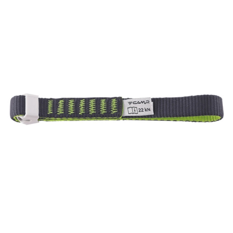 CAMP's Sling Stop KS Quickdraw Slings are 16 mm Nylon dogbones equipped with the Karstop Evo carabiner retainer on the rope end. The Karstop Evo is a strong urethane rubber keeper that fits snugly to the carabiner to prevent it from shifting. The bolt-end