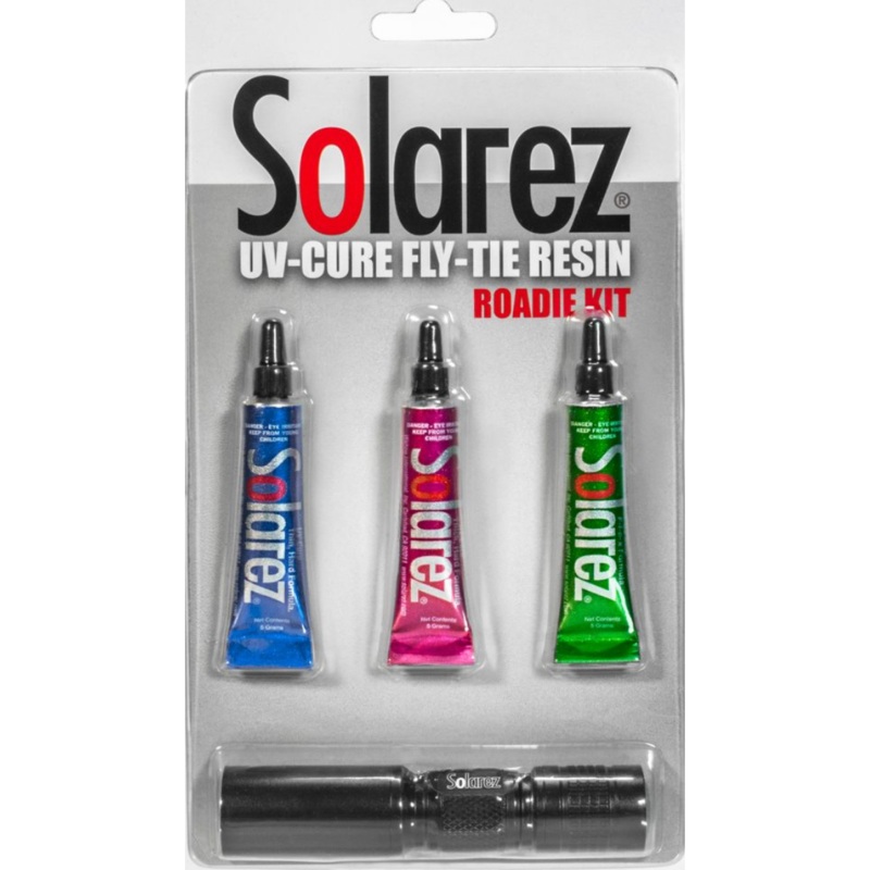 All three of our Solarez fly-tie UV resins; Thin-Hard, Thick-Hard, & FLEX formulas. Each comes in a 5-gram tube (1/10 oz) with applicator tip ample for many lures. Also included is a UV Very High Output flashlight with optimal wavelength. (this flashlight