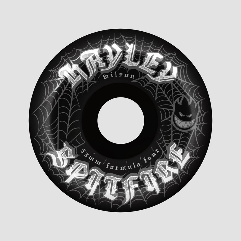 Spitfire Wheels Hayley Webbed Formula Four Conical Full Wheels.Hayley Wilson pro model wheels.53mm.99a flatspot resistant premium compound.Black urethane.Double conical profile.Smooth running surface, predictable slide, straight out the packet,21mm running