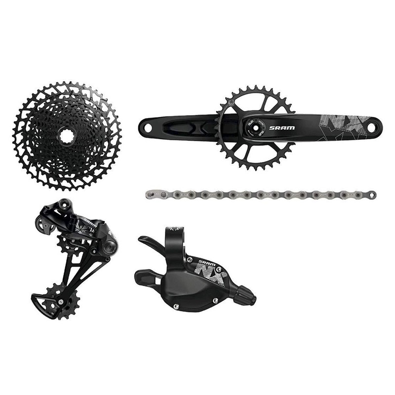This is SRAMS's NX Eagle Groupset. The NX Eagle groupset brings the performance from the top-of-the-line XX1 Eagle groupset to a bigger variety of riders. This complete groupset includes; a trigger shifter, rear derailleur, crankset, cassette, and chain.NX