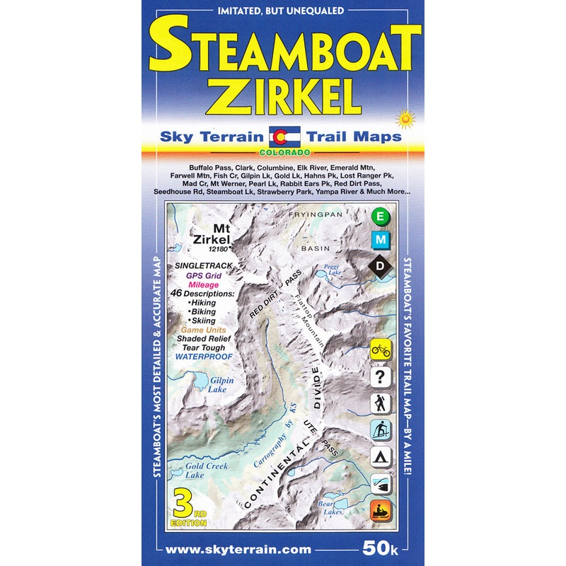 Sky Terrain Trail Maps' Steamboat Springs Mount Zirkel is a 1:50,000 scale map that covers 16 USGS quads. The towns shown include Steamboat Springs, Clark, Columbine, Hahns Peak and Milner. A huge stretch of the Park Range and the Continental Divide is map