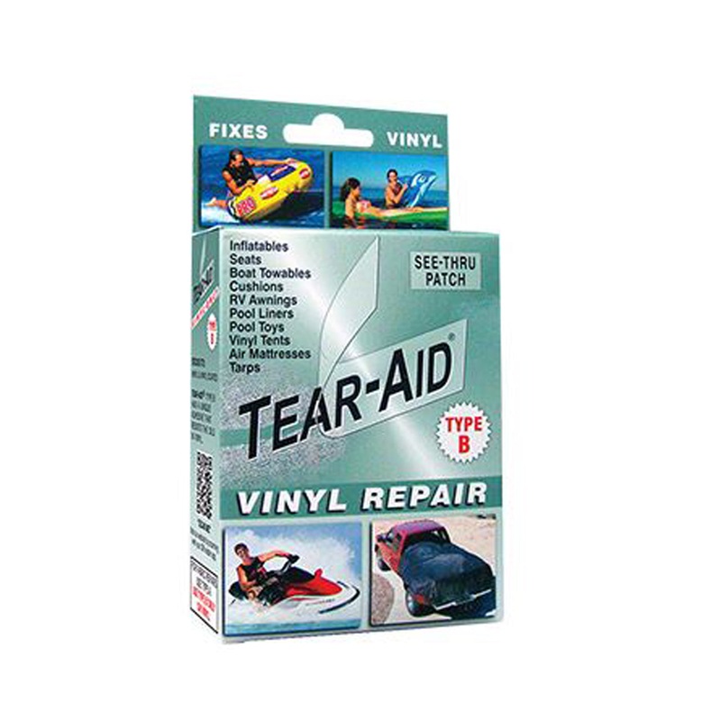 Type B: Sticks to vinyl and vinyl-coated materials. Has unique adhesive that resists the oils in vinyl.Kit contains: (1) 3"x12" TEAR-AID patch, (1) 7/8" square patch, (1) 1 3/8" square patch, (1) 12" Reinforcement filament for repairing tears at edges. (2)