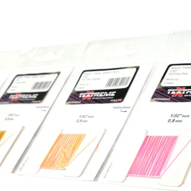 Textreme Magic Tinsel is Sspecial pearlescent/ultraviolet film overdyed in beautiful colors. It be used for many applications, as wing case, ribbing and as main material for bodies with changing shades. It is translucent. Thanks to its special laminating by pullin it gently you can obtain small tubing with interesting characteristics. It can be used to rib or reinforce bodies, in place of copper wire thanks to its strength. This tubing can be also used to form entire bodies or part of them, by wrapping it as a normal thread thanks to its softness and malleability. By creating an underbody with standard tying thread or with floss, you can get infinite color and flash variations on your fly.