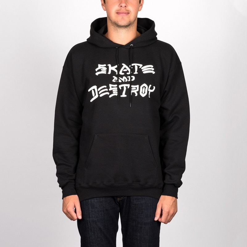 The Thrasher Skate And Destroy Hood is made from a cotton, poly blend and features a screen printed graphic to chest, drawstring adjusted hood and a front pouch pocket. Features: 90% cotton, 10% polyester. Pre-shrunk cotton. Regular fit. Skate and Destroy
