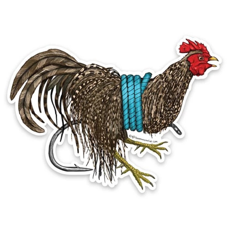 Sometimes you forget tho take the feathers off the bird!?! - This is an original art by Karl Schwartz of a rooster tied to a hook is for all of us that love the art of fly tying and fly fishing.SIZE: 5" wide X 3.7" tallEach made from thick, durable vinyl w