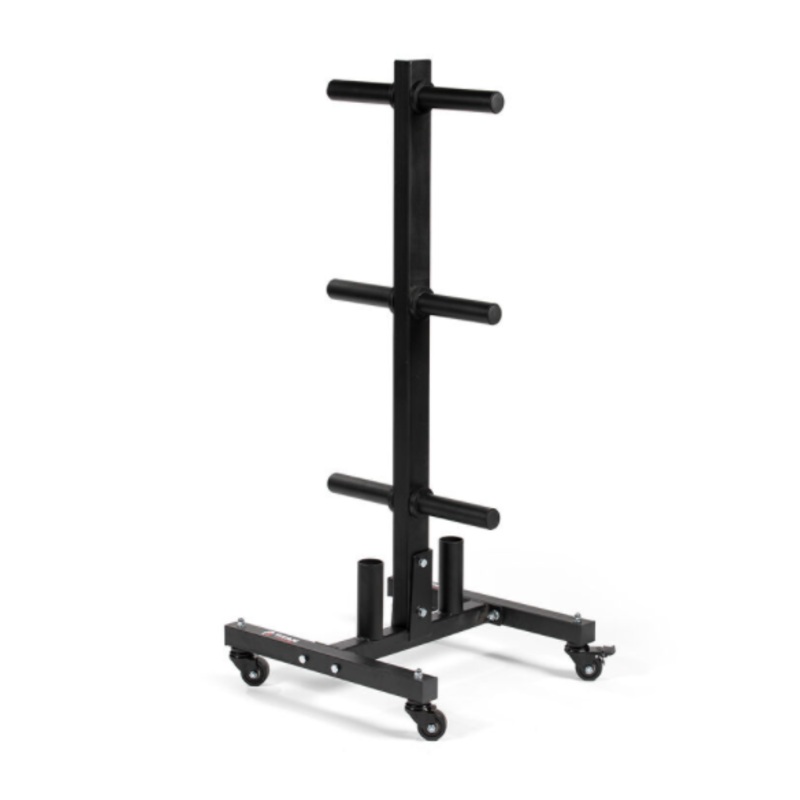 FEATURES:- Fits two full-sized Olympic barbells for storage and transportation- Three-tiered weight posts on each side with 7-inch loadable sleeves- Caster wheels at the base keep your gym essentials portableSPECIFICATIONS:- Footprint: 24.5-in x 24.5-in.-