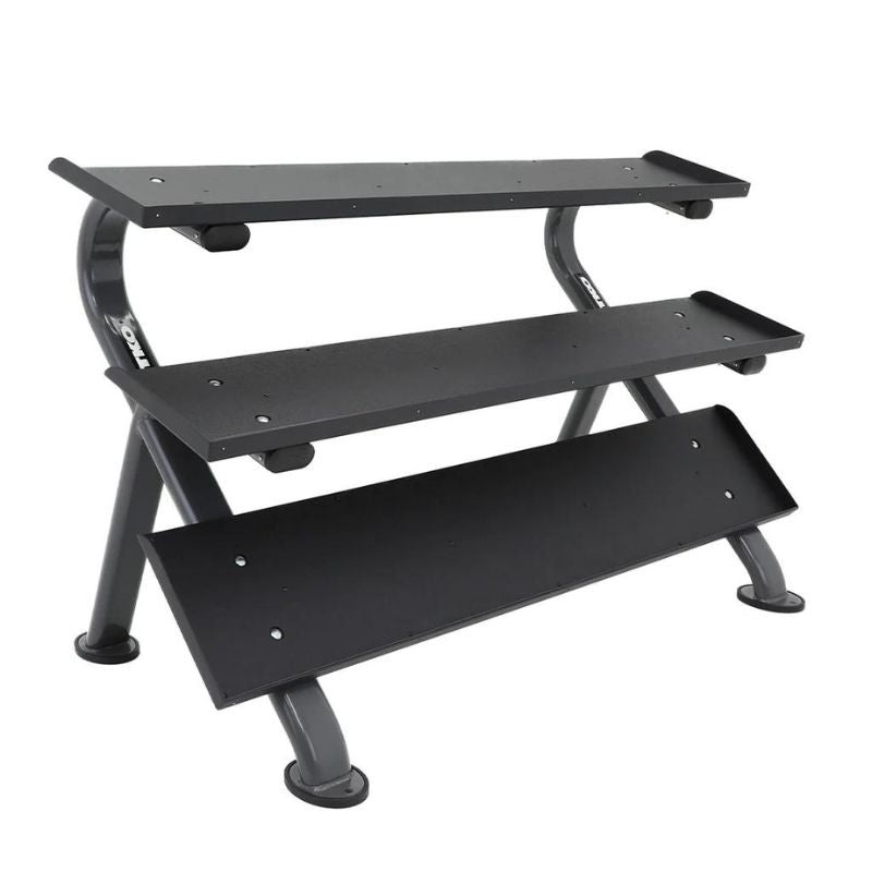 TKO Strength 3-Tier Horizontal Dumbbell Rack 890HDR-BTKO 3-Tier full commercial rack allows for up to 15 pairs of dumbbells to be stored on a heavy gauge steel shelf, coated with a unique styrene liner to prevent damage to the shelf and the product, keepin