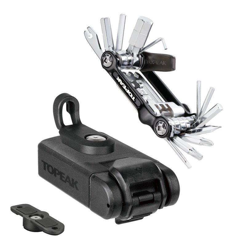 Mounts under Ninja water bottle cage with interchangeable Cage Mount or use alone with Frame Mount. This weatherproof toolbox contains a 23-function mini tool for basic repair and maintenance.