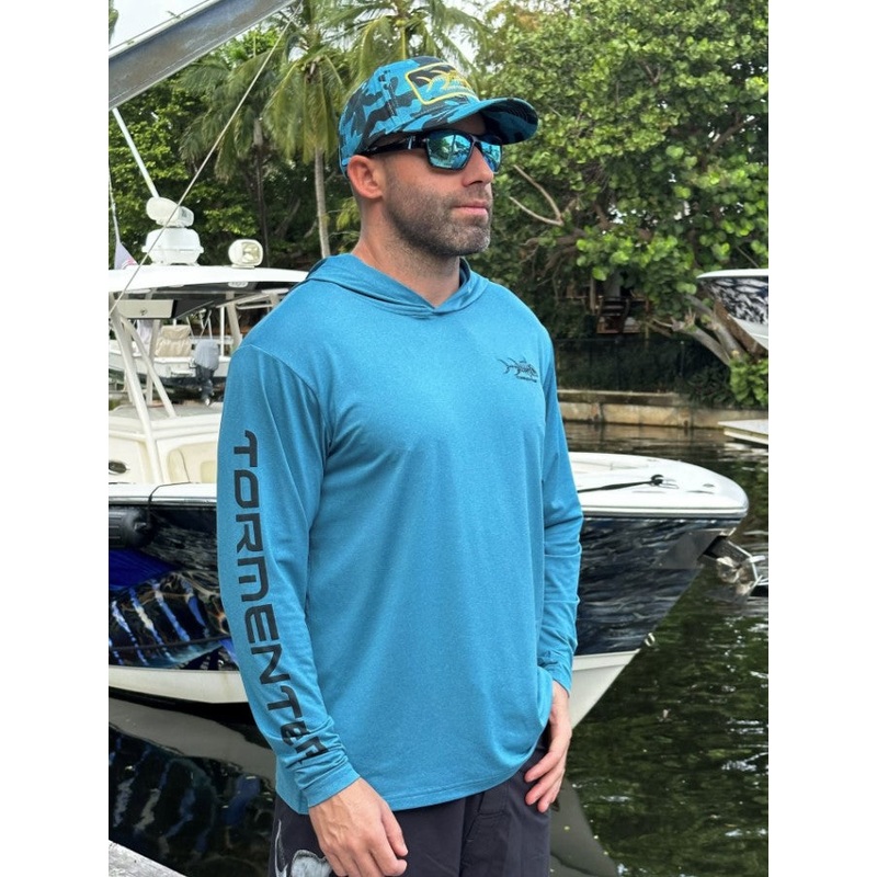 Discover the incredibly soft Tormenter Ocean SPF-50 Heather Performance Hoodie a perfect fusion of style and functionality, ideal for fishing enthusiasts or anyone else for that matter. Whether you are Fishing, between surf sessions, jogging, biking, skate