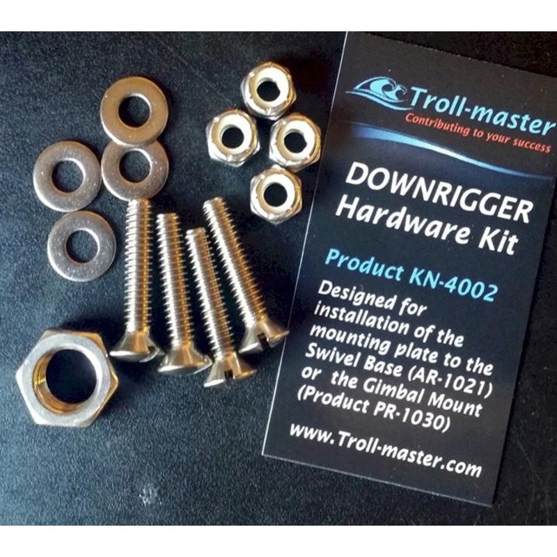 Troll Master Downrigger mount hardware kits to install downriggers and downrigger base plates.Troll-Master KN-4002 Downrigger Base Plate Mounting Hardware Kit (SKU:TMK117DHK)This kit consists of:- 4 x Stainless oval head slotted screws 1-1/4 inch long - 4