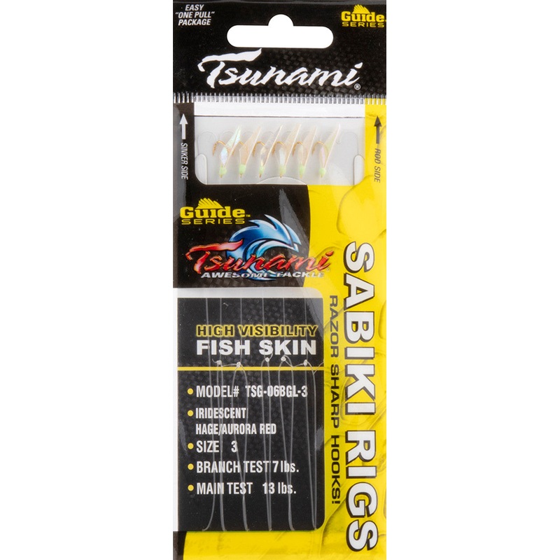 Tsunami Guide Series Sabiki Rigs are the ultimate tool for catching bait in both inshore and offshore waters! Nothing catches big fish like live bait, and these sabiki rigs are equipped with six razor sharp dressed hooks to catch baitfish like herring, sar