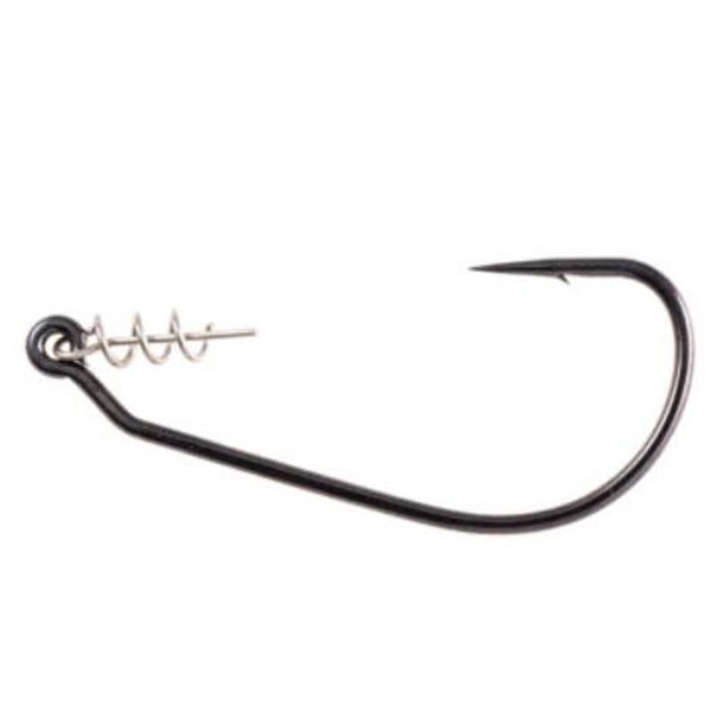 This bass hook is Unique with its TwistLOCK Centering-Pin Spring (Patented) attached to the hook eye. Baits can be permanently secured by inserting the pin in the center of the nose of a soft plastic, which can then be twisted (screwed) onto the TwistLOCK