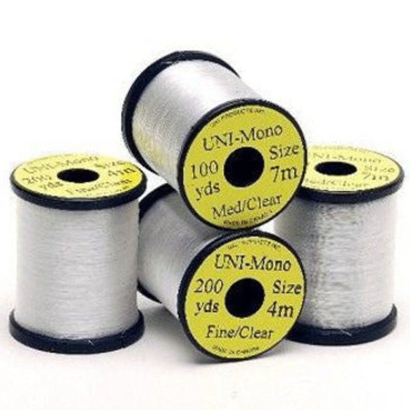 UNI Mono Fly Tying Tread is a translucent monofilament thread ideal for tying salt water flies. Fine, supple monofilament200 yards on a spool - fine and clear .004" (.10 mm.)100 yards on a spool - medium clear .007" (.18 mm.)