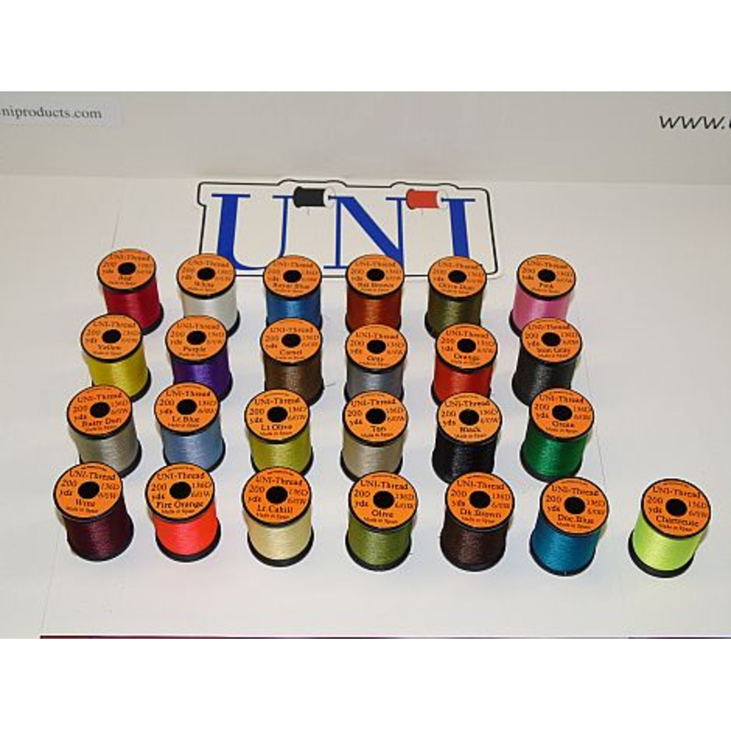 - 6/0 UNI-Thread is a general fly-tying thread of continuous polyester filaments. The wide range of twenty-five colours meets virtually all fly-tying needs. 136 denier.