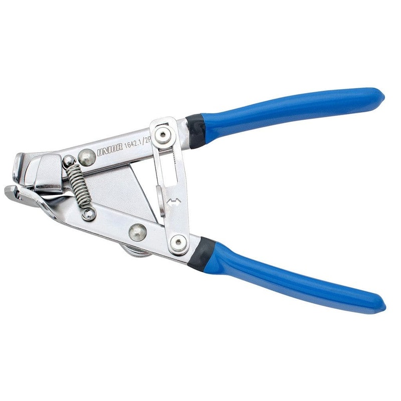 The basic function of the inner wire pliers is to tension brake and derailleur steel cables. It is used for holding the inner cable and pulling it out of the housing. The safety lock is activated with a thumb push. The pliers can now be released and the cable fixed. The lock is automatically released by squeezing handles together. The additional safety lock enables easier, faster, and more comfortable use.