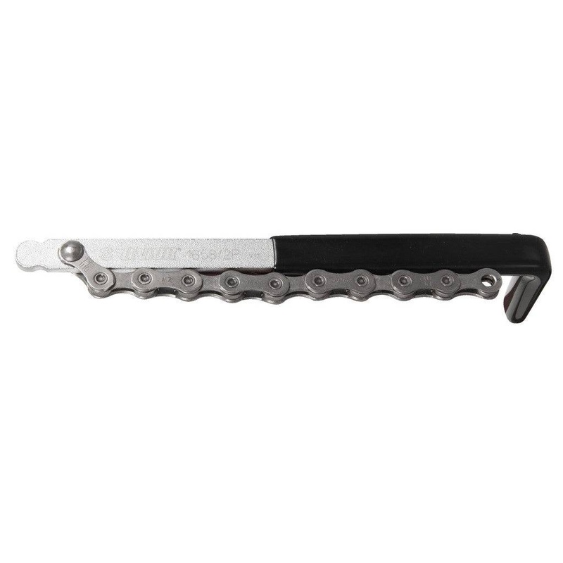 The sprocket wear indicator is used to determine the condition of the rear sprockets. It can be used to check 12 to 21 tooth sprockets. Procedure: The chain is put on the sprocket and the tool is placed with its round end between two teeth on the upper sprocket side. The last chain link is moved away from the sprocket and a force of 100 N or 10 kg is applied to the tool in the direction of sprocket rotation. Now the last chain link is moved towards the sprocket. If it skips easily to the cog the sprocket is in a good condition and will function flawlessly even with a new chain. However, if the last chain link gets stuck on the tip of the neighboring tooth or if we have to force it to skip on the cog, the sprocket is worn out and should be replaced. In case the chain falls off the clog when applying force, the sprocket is heavily worn out and a replacement is overdue.