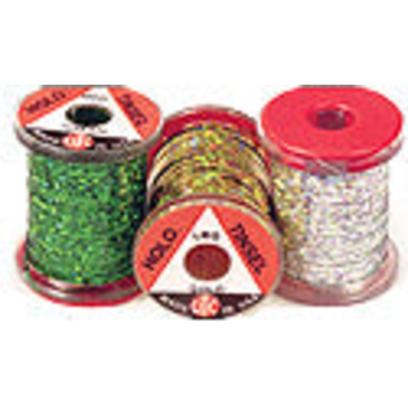 UTC Holographic Tinsel brightens up flashback nymphs and underbodies on nymphs and streamers. This is a bright, 3-D holographic tinsel that is robust and made in small, medium and large sizes to cover all hook sizes. Used for tinsel body streamers like the
