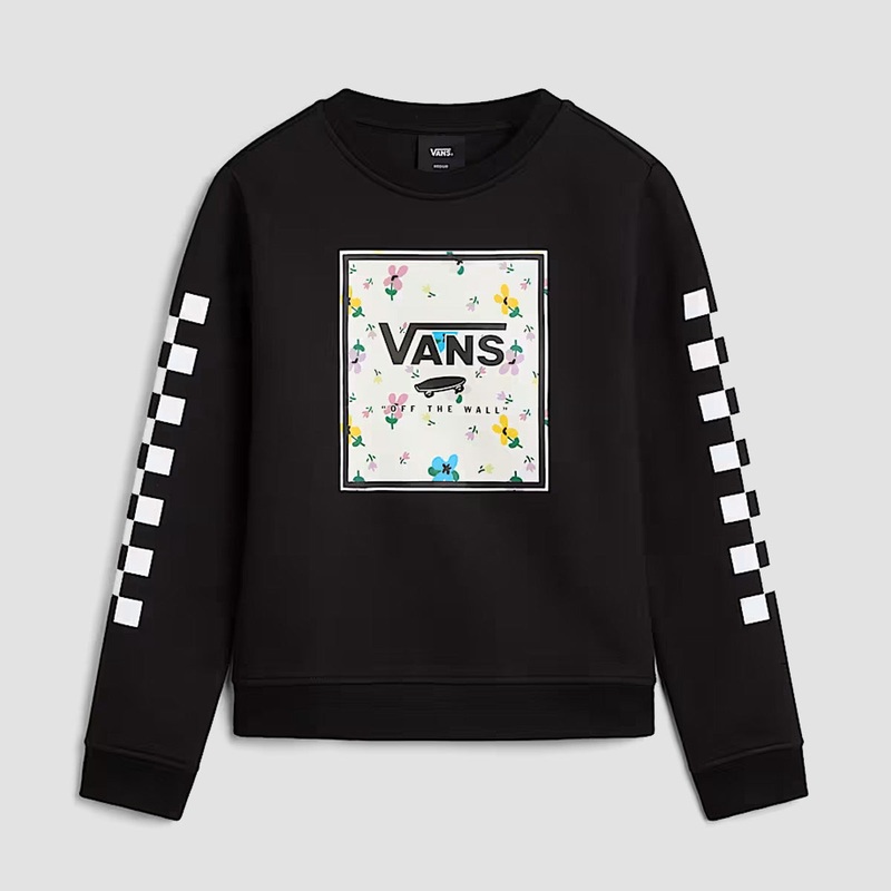 The Vans Girls Bloomer Boxed Crew Sweatshirt has a crew neck, long sleeves and the Vans skateboard logo on the front. It also has a checkerboard print down both sleeves.